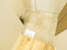 ドアを開けますと、広々とした専用庭にある緑が奥の方に見えます。右側には上に吊棚とカウンターの玄関収納があります。