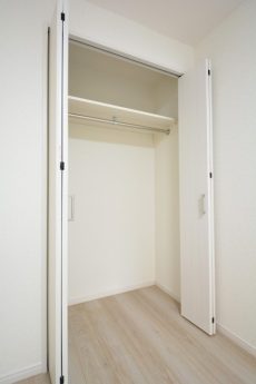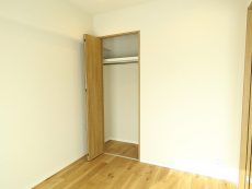こちらもテラス・専用庭に面しているクローゼット付きの6.0帖の洋室です。各お部屋、シンプルモダンなアクセントクロスでゆったりとリラックスできる雰囲気です。クローゼットも横幅はそこまで大きくはありませんが奥行きがるので活用できそうです。