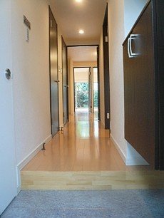 突き当りのドアまで真っ直ぐに伸びる廊下。両側には扉が並んでいます。中間調のフローリングと白いクロスのナチュラルな雰囲気ですね。