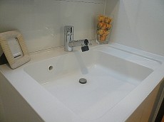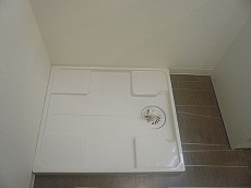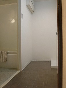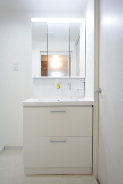 サニタリールームです。左側に浴室、右側手前に洗面台、並びに洗濯機置き場です。