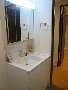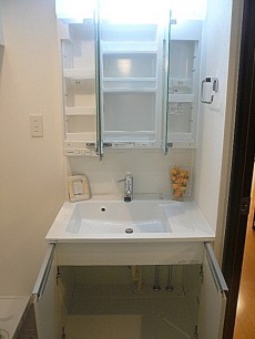 パナソニック製シャワー付き洗面台です。大きな三面鏡はみやすく真っ白なウォッシュボウルは清潔感あり掃除を心がけますね。