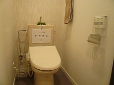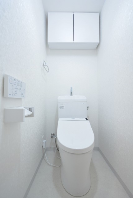 ウォシュレット付きトイレです。吊戸棚にはトイレットペーパやトイレマットなどの収納に良いですね。