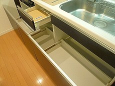 キッチン収納は嬉しい引き出しタイプ。一つ一つの引き出しが大きく、嬉しい仕切り付き。これなら何種類かのフライパンがあっても、ペタッと置くのでなく横向きに置くことができ場所もとらずにすみます。パスタをゆでたりする深いお鍋も楽々置けちゃいます。