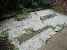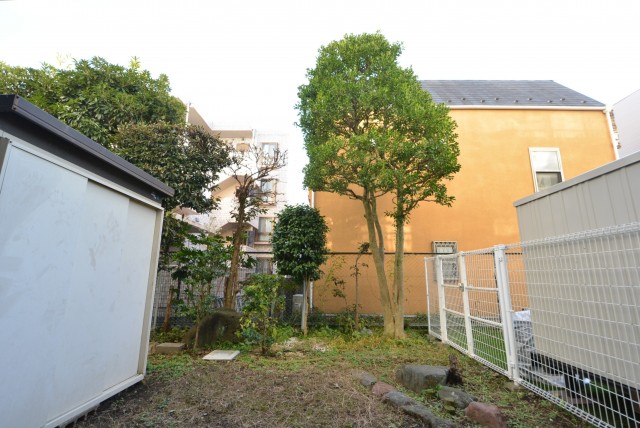 テラス部分があり、その先が自然溢れるお庭になっています。前にお住まいの方が作られたのでしょうか、花壇の縁だと思われる石などが置いてあったりして『お庭』って感じがしますね。園芸用品を入れておいたり出来る物置も付いています。