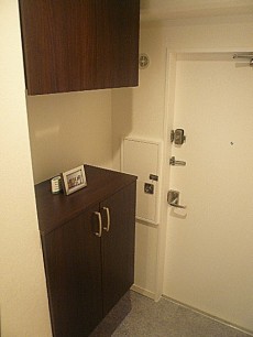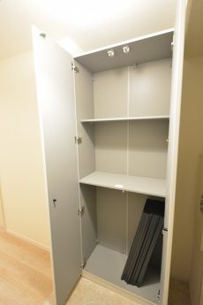 玄関内にはトールタイプのシューズボックスと、収納がありました。下に立て掛けてある黒いのが棚板です。セットされてないとシューズボックスっぽくないですよね^^;)収納の方は、棚も何もないフリーなスペースになっています。大きな物をそのまま置いたり、ご自身で棚などを置くのもいいですね。