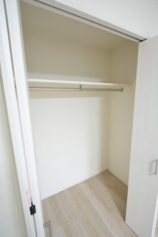 収納はクローゼット。間口が広く中がひと目で確認出来る、使いやすそうなクローゼットです。奥行きもあって大きな物も置いておけますよ。