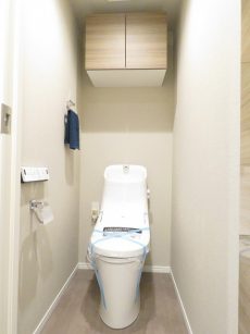 トイレはINAX製の洗浄機能一体型。つい「ウォシュレット」って言ってしまいがちですがこれはTOTOの商品名、INAX(LIXIL)製なので「シャワートイレ」と呼びましょう。トイレットペーパーや掃除道具を入れておける吊戸棚も付いています。