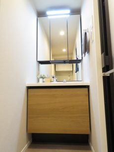 洗面化粧台は鏡の裏、引き出しと収納スペースがたっぷり。