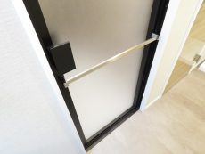 玄関から真っ直ぐに伸びた廊下には、正面のガラス扉を通してお部屋からの光が差し込んでいます。夜には人感センサーが自動的に照明を点けてくれるので、暗い中手探りでスイッチを探すなんてこともありませんよ。