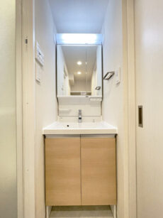 洗面室には洗面化粧台の他に洗濯機スペースと浴室がまとまっていて脱衣所を兼ねています。洗面化粧台はミラーキャビネット付きなので洗面周りの細々とした物もスッキリ片付けることが出来ますよ。