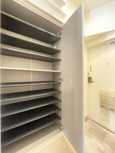 シューズボックスは収納力のあるトールタイプ。棚板が調節可能なので背の高い靴もきれいに収まります。
