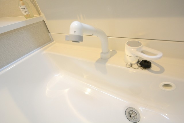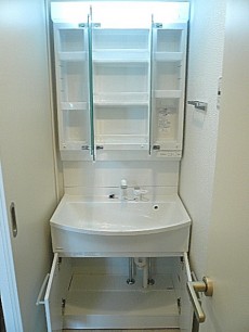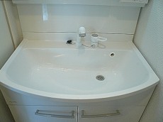 洗面化粧台です。使い勝手の良さそうな大きな洗面ボウルは広さと深さがありつけ置きなどもできそうです。上下にある収納は細かいものからお掃除道具まで仕舞えそうです。