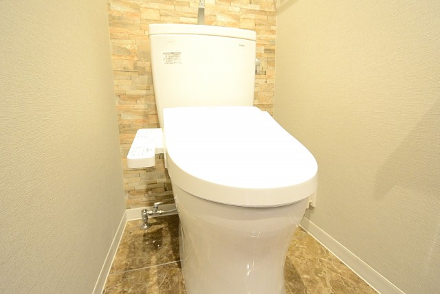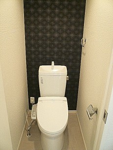 ウォシュレット付トイレです。スタイリッシュなアクセントクロス、オシャレな芳香剤を合わせて置きたくなります~