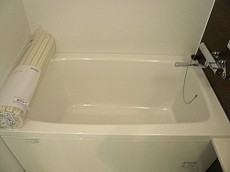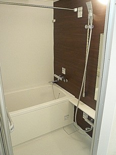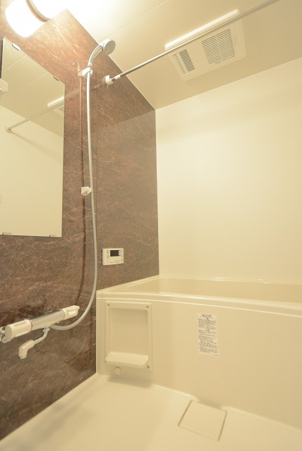 ブラウンのパネルがアクセントになっているバスルームです。浴室換気乾燥付きなので梅雨の今まさに湿気や雨の日などは洗濯物も浴室で干せますね!