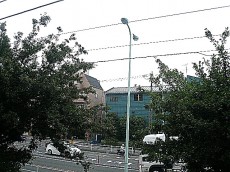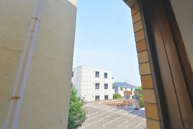 外はエントランス前の通りを挟んで住宅が続く風景。高い建物がないので陽ざしがよく届きます。