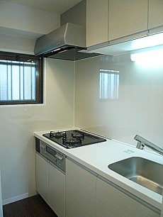キッチンは落ち着きのあるダークブラウン。対面式ではありませんが、キッチンカウンター越しにリビングダイニングが見渡せます。スペックは浄水機能付き水栓、3口ガスコンロ、食洗機と◎。お料理好きな奥様はきっと腕がなるはず・・・。