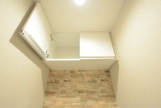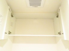 トイレはウォシュレット付き。ペーパーのストックを仕舞うのに便利な吊戸棚が設置されています。