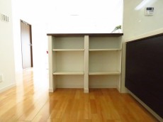 洗濯機置場の横にはカウンターと可動棚付の収納も設けられています。