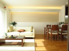 LDKは約15.2帖の縦長空間。南向きの窓から差し込む陽ざしはお部屋の中心あたりまで入ります♪壁面の一部はエコカラット+カウンターになっており、リビングのいいアクセントに♪お部屋に設置された家具もついてきます。