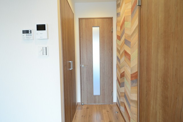 廊下をさらに奥へ。水回りの設備と廊下収納があります。
