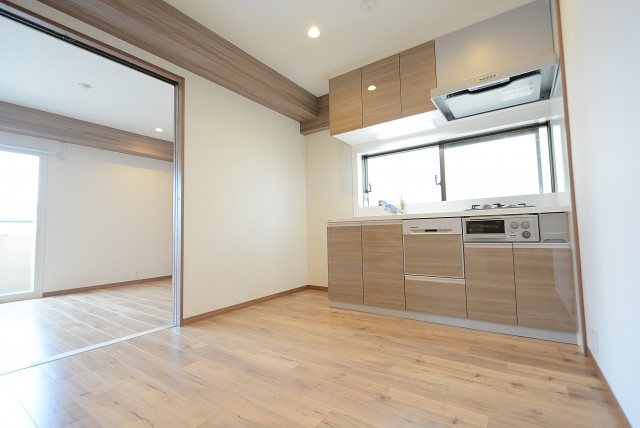 バルコニーに面しているリビングダイニングキッチンです。お隣にある洋室の3枚の引き戸を開けますと~