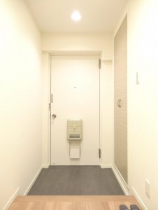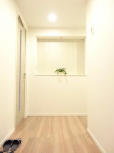 白基調の明るい玄関ホール。人感センサーがついているので必要な時だけパッと照明がつきます。経済的で安心です。