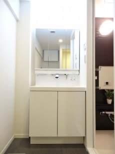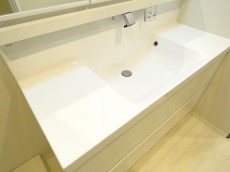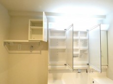 洗面化粧台は3面鏡の裏が一面収納になっており、ハブラシやコスメなどのゴチャゴチャしがちなアイテムもスッキり収納いただけます。生活感も隠しておけるのがうれしいですね。