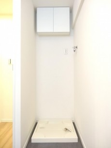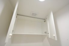 洗濯機置場の上には吊戸棚が設置。洗濯用品も手の届くところに保管しておけます。
