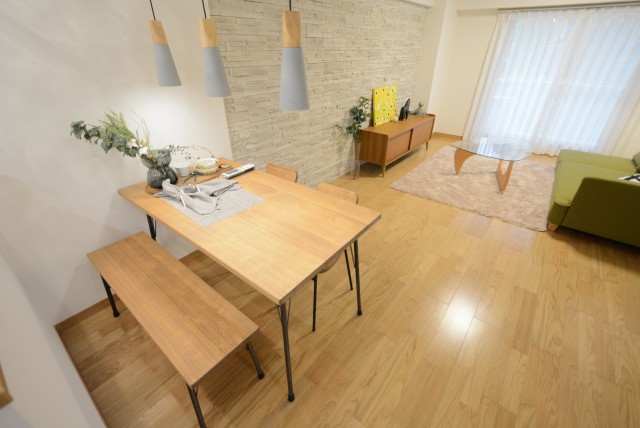 LDKは約23.1帖。南・西の2面に窓から明るい光が差し込む広々とした空間は家族の憩いの場にぴったり!大きなダイニングテーブルやソファもゆったりと置けそうです。