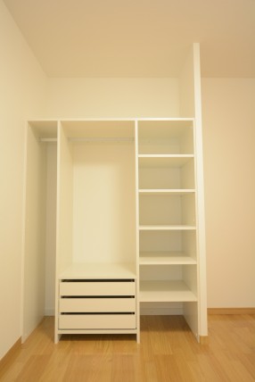 上部には大きな物が置ける棚、丈の長い物を掛けるパイプ、丈の短い物を掛けるパイプ、細かい物を入れる引き出し、自由に高さが変えられる棚など、いろいろ考えられています。