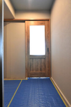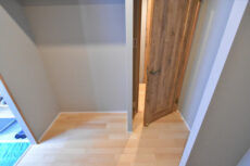 シューズインクローゼットを兼ねた広いスペース。玄関と同じ床面で段差もないのでキャリーバッグやベビーカーなどを置いておくのにも良さそうですね。ちなみに青い養生シートが張られた床はグレー系の落ち着いた感じなのでご安心を。