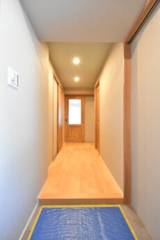 玄関を入ると正面には土間への扉、左方向へお部屋へ続く廊下が伸びています。戸口からお部屋のドアが見えない構造なので、宅配便やフードデリバリーの受け取り時に室内が見えてしまうこともありません。人感センサー付きの照明でいつでも明るい玄関が迎えてくれますよ。