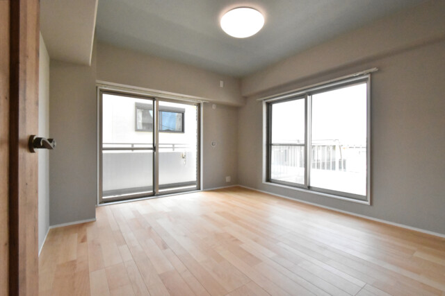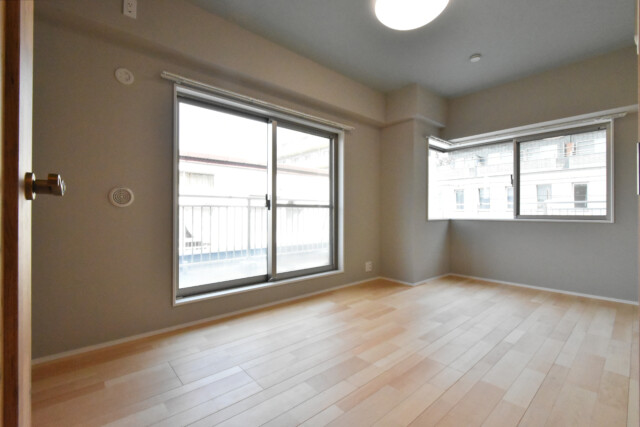 北西向きのバルコニーとルーフバルコニーの北東向き部分に面したお部屋です。十分な広さがあって大きなベッドも余裕で置けそうですね。