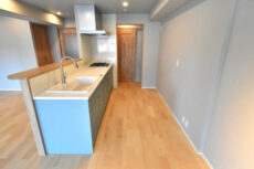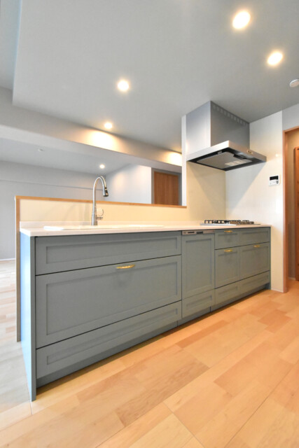 夕食の支度をしながらお子様の話に耳を傾けたり、お茶の準備をしながらご友人の会話の輪に加わったりと、リビングダイニングとの一体感が抜群のキッチンです。ヴィンテージ感のあるグレイッシュブルーの調理台、かわいいですね♬