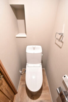 トイレはINAX製の洗浄機能一体型。いろいろ飾ってインテリアを楽しんだり、トイレットペーのストックを置いたり出来るニッチカウンターが付いています。