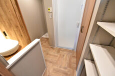 洗面室には洗面化粧台の他に洗濯機スペース、物入、浴室がまとまっていて脱衣室も兼ねています。扉のひとつは廊下に通じているので直接入ることも出来ますよ。買い物から帰ったらここで手を洗ってからキッチンへ・・・動線バッチリですね!