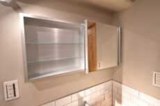 鏡はスライドして左右に動きます。裏がキャビネットになっているので、洗面周りのものもスッキリと片付けることが出来ますよ。