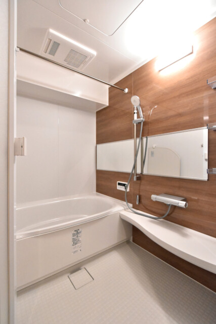 浴室は白を基調に木目のアクセントパネルを使用。リラックスしたバスタイムで一日の疲れも洗い流せそうですね♬