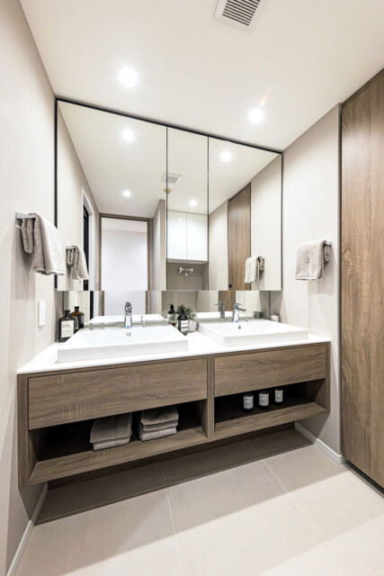 洗面化粧台は身だしなみを整えるのに便利な三面鏡付き。裏がキャビネットになっているので、洗面周りに散らかりがちな細々したものもスッキリと片付けることができますよ。