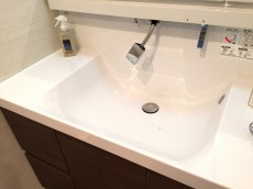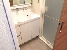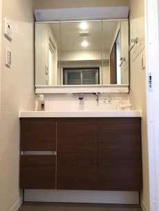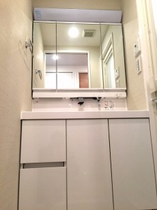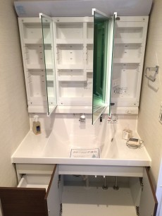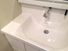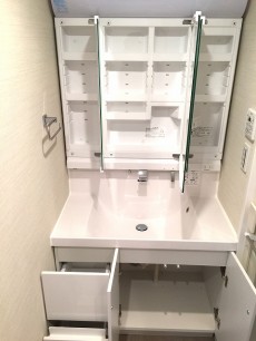 入って右手には、大きめサイズの洗面台です。新規交換済みでピッカピカ♪♪鏡裏とカウンター下には収納もたっぷり確保されています。