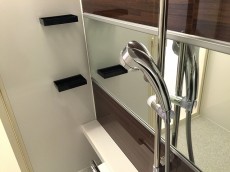 ミラー横にもシャンプーなどのボトルもキレイに並べて置ける棚があり、清潔感のある空間を保つことができます♪♪モザイクパターンの床は、水はけが良く、すばやく乾燥します。