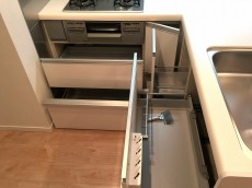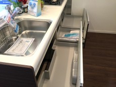 対面式なので上部に収納はございませんが、シンク下の収納は、スライド式なのでキッチングッズの収納も楽々 (●´∀`)配管を気にせず収納できるので大容量。