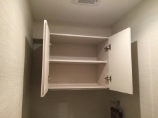 廊下左手にはトイレです☆トイレは嬉しいウォシュレット付になります。上部には、扉付の収納棚があるので、ストック品の収納も完璧です♪♪