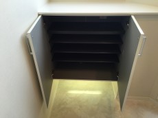 廊下に戻ってお隣に扉付きのクローゼットがあります。可動式の棚です。