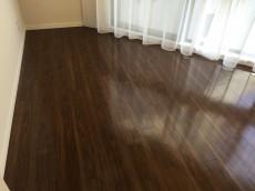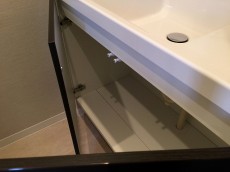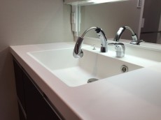 洗面台は、お部屋のフローリングの色調に合わせた落ち着いた木調の洗面台です。新規交換済みでピッカピカ。