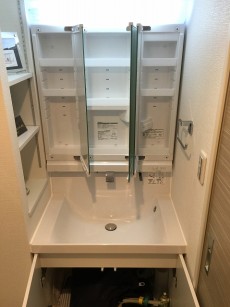 洗面化粧台は身だしなみを整えるのに便利な三面鏡付き。洗面化粧台の他に洗濯機スペース、浴室がまとまっていて脱衣室も兼ねています。タオルや日用品をすっきり収納できるリネン棚があって便利ですよね。