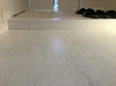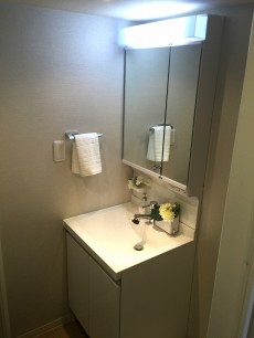 トイレの反対側は、洗面室&バスルームです。一段高くなっています。左手手前に洗面台、左手奥に洗濯機置場、正面にバスルームの並びになっています。