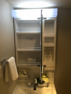 真っ白な洗面台は、新しく交換したばかりでピカピカなコンパクトサイズの洗面台です☆鏡の裏はたくさんポケットのついた収納になっていて、細かいもので溢れがちな洗面周りがスッキリ片付いて便利です♪