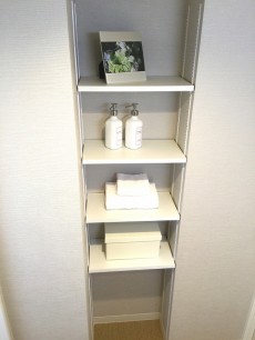 洗面室には、可動式棚の収納が用意されています♪♪リネンの収納もバッチリ。洗剤等の収納にも役立ちますね(´∀`*)