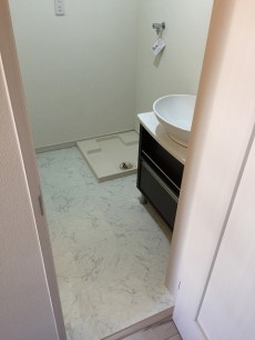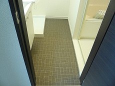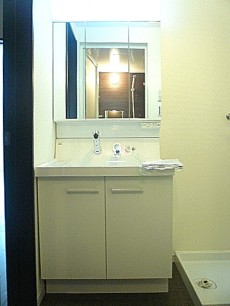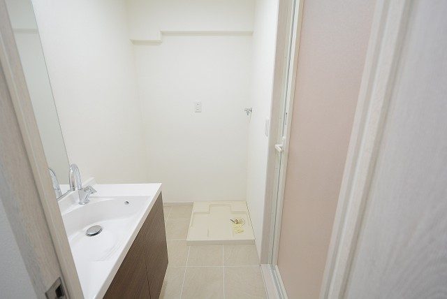左側に洗面化粧台、並びに洗濯機置き場、右側に浴室となっています。